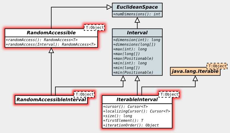 The UML diagram below shows the integer part of the Accessible interface hierarchy. We will look at the full diagram including Accessibles for real coordinates later. Accessible interfaces have been highlighted.